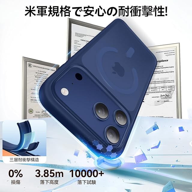 【米軍MIL規格・指紋防止】MIL規格3x耐衝撃設計で高さ3.85Mの落下テスト済み。さらにカメラ保護ボタンとレンズ凸起ガードで、撮影時の不意な衝撃や日常使用の擦れも完全防御。通勤中や外出先、カフェでの作業中でも安心してスマホを使え、スマホの細部までしっかり守ります。特許取得済みの撥油塗装で、5年後でもさっぱりした質感を維持し、指紋の付着問題を完全に解消!対応機種:いphone17promaxケース magsafe対応