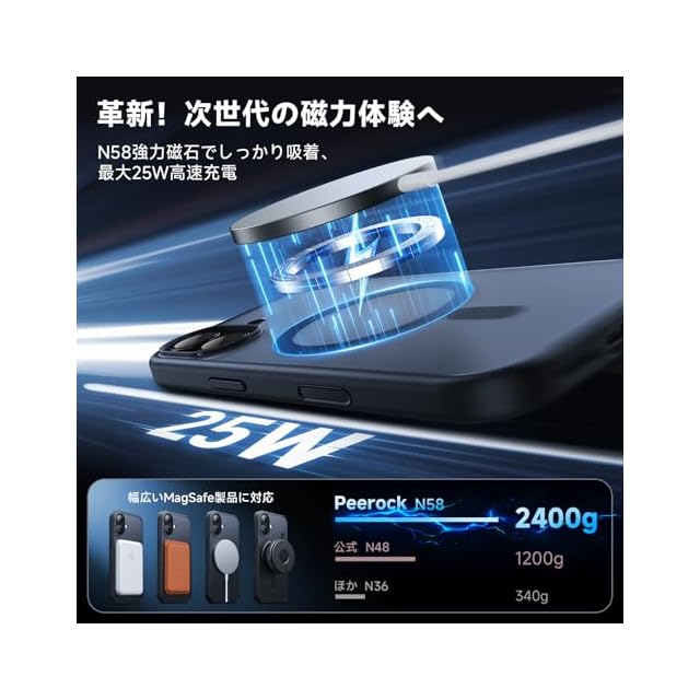 【急速充電!最大25W高速充電】このスマホケースはN56マグネット搭載でMagSafeアクセサリーと完全互換。車載ホルダーやワイヤレス充電器に強力吸着し、97%の高効率充電を実現。磁石配置を最適化し、長期間の使用でも充電中の影響を最小限に抑え、最大25Wの高速ワイヤレス充電をほぼエネルギー損失なく実現します。対応機種:いphone17ケース