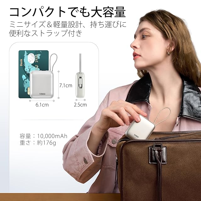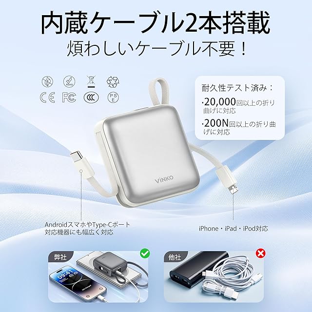 商品名:VINKO モバイルバッテリー 軽量 小型 10000mAh 3c認証 ccc 大容量 -スマホバッテリー 急速充電 Lightning type-c ケーブル内蔵 -携帯充電器 PD 22.5W 3台同時充電 スマホ 持ち運び iPhone 17/16/15 Android iPad 各種機器対応 コンパクト&軽量 機内持ち込み 旅行/出張/アウトドア/停電対策/防災 PSE認証済 (シルバー)