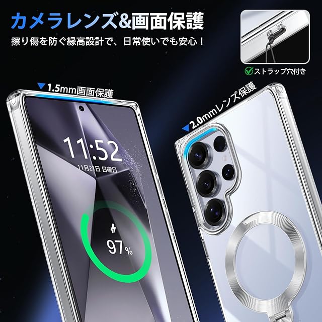 Galaxy S24 Ultraの魅力を最大限に引き出す、多機能で安心のスマホケースが登場!360°回転のリングスタンドは縦横両対応で、動画視聴やビデオ通話など様々なシーンで大活躍。さらに、MagSafe対応の強力な磁石を搭載しており、このGalaxy S24 Ultraカバーを装着したままでも安定したワイヤレス充電が可能です。米軍MIL規格準拠の耐衝撃構造と、四隅のエアクッション、カメラや画面を守る高設計で、落下や衝撃からスマホをしっかり保護。透明度の高いドイツ製素材を採用し、黄ばみにくく、美しい外観を長くキープ。機能性・耐久性・デザインを兼ね備えたギャラクシーs24ウルトラ カバーを、この機会にぜひお試しくださいませ。