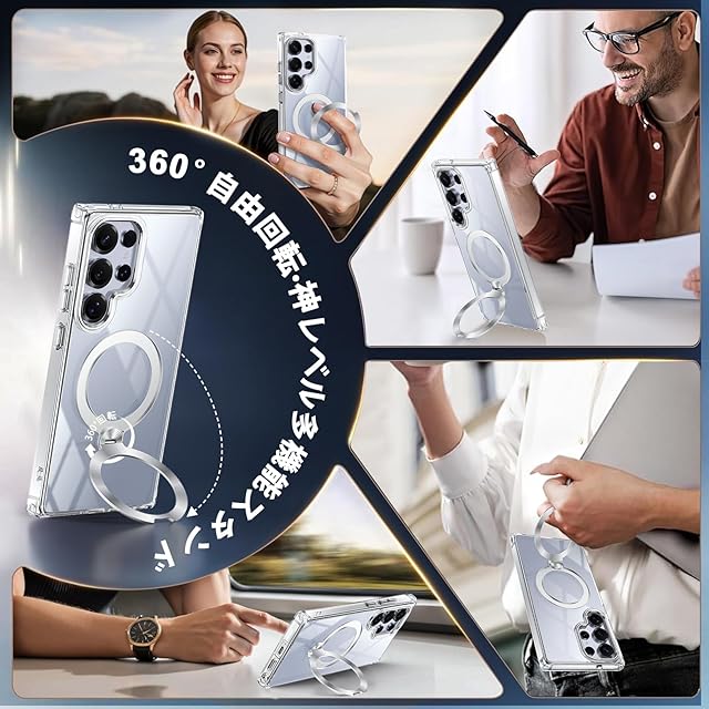 【360°回転リングスタンド・縦横対応で角度自由】強力マグネット内蔵の360°回転リングスタンドを搭載。新幹線での動画視聴、カフェでのビデオ会議、デスクでの資料確認など、あらゆるビジネスシーンでハンズフリーを実現。強磁力設計によりスタンドがしっかり固定され、安定性抜群。また、スマホリングとしても使用でき、片手で簡単に操作できます。さらに、全隠し式スタンドデザインで、使用しない時は水平に収納でき、スペースを節約して携帯に便利です。このギャラクシー S24 ウルトラクリアケースは、スマートフォンの使い方をさらに広げます。