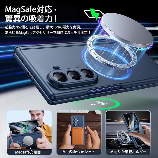 【MagSafe対応・高速ワイヤレス充電を妨げない設計】MagSafe対応ワイヤレス充電器と完全互換。業界最強のN52磁石を搭載し、16Nの強力な磁力を実現。このギャラクシー z フォールド7 ケースを装着した状態でも、高速かつ効率的なワイヤレス充電を実現できます。強力な磁力が充電器を正確に吸着・固定するため、充電中のズレや接続不良を防止。ワイヤレス充電器、モバイルバッテリー、リング、ウォレット、さまざまなアクセサリーと組み合わせ、MagSafe対応のあらゆる場所にスマホを磁力で固定可能で、生活がより便利に。ご注意:この製品はすべての Magsafe デバイスと互換性がありますが、Qi ワイヤレス充電には適していないため、ご購入前にご検討いただければ幸いです。