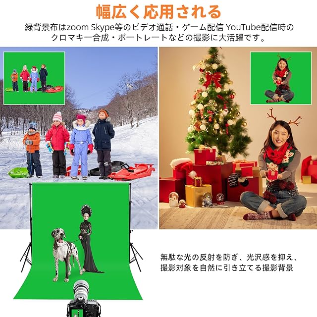 厚手版、背景が透けにくい:このグリーンバック 布は重さが約1.2kg、一般的な背景布 緑より厚くて重いので、撮影 背景が透けにくい。★この撮影用 グリーンバックは余計な光の反射を防げるし、光沢感を抑えるので、撮影対象をより自然に引き立てられます。★よく在宅撮影やスタジオ撮影やイベント飾り付けなどに活躍されるクロマキー 布です。