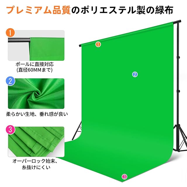しっかりした生地、垂れ感が良い:この300×300cmのグリーンバックはポリエステルの材質で、綿製よりシワが目立たないし、低温アイロンでシワを簡単に取れます。