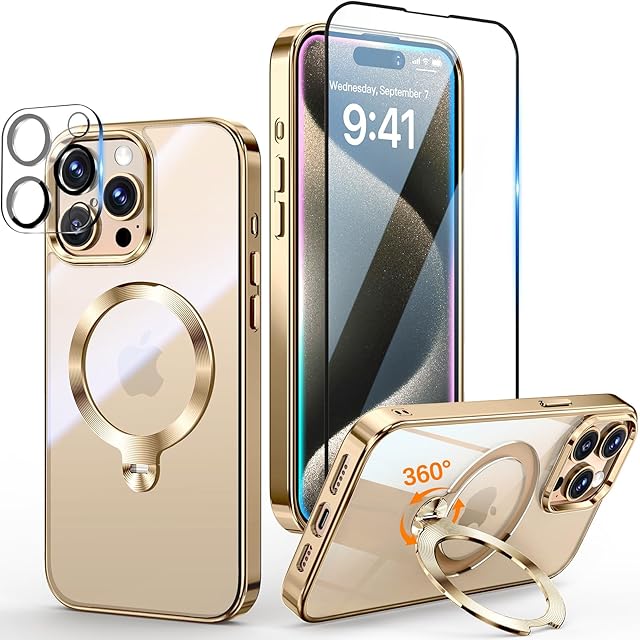 【三重保護セット!永久黄変防止】OYR iPhone 15 Pro用クリア ケース Magsafe 対応[360°回転CD スタンド・10 万回開閉テスト][メッキバンパー・iPhone専属色][カメラ保護とガラスフィルム付き]ストラップホール付き マグセーフ アイホン15プロケース マホケース15 Pro 人気 米軍MIL規格取得・耐衝撃(6.1インチ・ゴールド)
