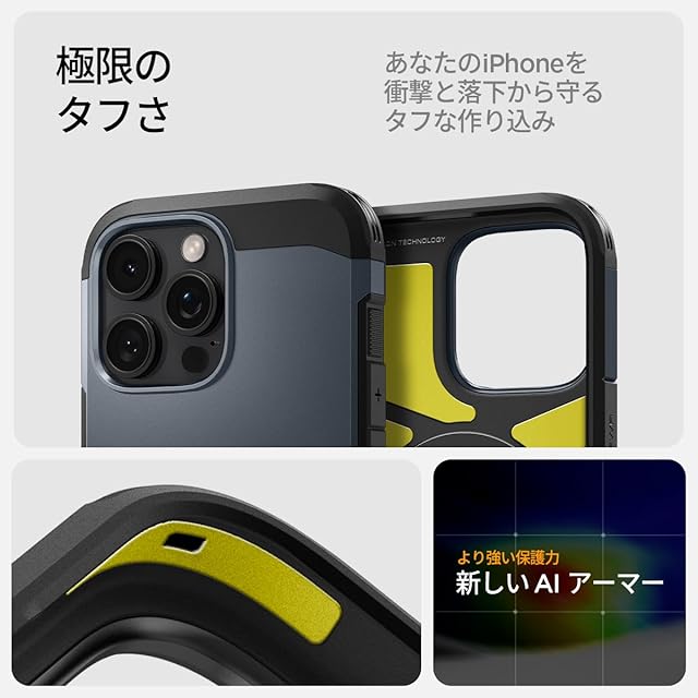 【AIを利用したSpigen最強の耐衝撃ケース】装脱着が簡単になる柔らかいTPU(熱可塑性ポリウレタン)に丈夫なPC(ポリカーボネート)をハイブリッドさせた2重構造でデバイスを守ります。AI(人工知能)から衝撃を受けやすいと予測してもらった部位に黄色い「XRDパッド」を付着し、落下時の衝撃を吸収させることでさらに保護力を極めました。