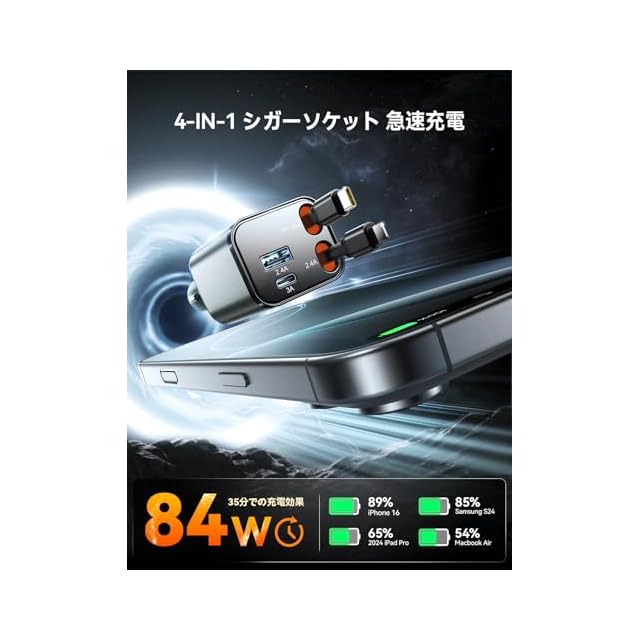⚡【最大84Wのパワフル出力|4台同時充電可能】 **4台同時充電対応!**Type-C(PD45W)+ iPhone(12W)巻き取り式ケーブルに加え、USB-C(QC15W)&USB-A(QC12W)の4ポート搭載します。MacBook Air、iPad、Galaxy S25 Ultra、iPhone 16など最新デバイスの急速充電が可能です。 家族旅行やビジネス出張、長距離ドライブに最適!車 スマホ 充電のニーズを1台で解決する高性能カーチャージャーです。