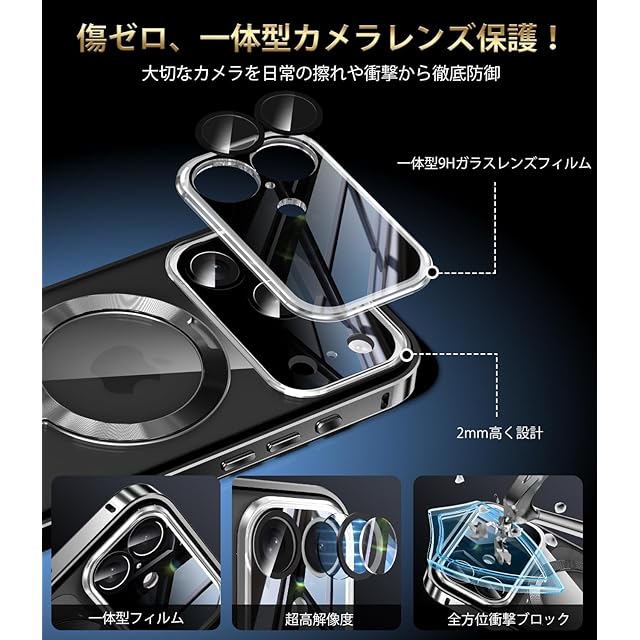 【9H強化ガラス!カメラレンズ保護!真・全面保護】このiPhone17ケースは、9H硬度の強化ガラスと高感度タッチに対応した全面保護設計で、傷や衝撃から端末をしっかり守りながら、快適な操作性を実現します。カメラレンズも一体型バンパーで、強化されたレンズガードにより大切なカメラをしっかり保護。日常の擦れや落下時のダメージを軽減し、画面保護フィルムが不要な点も魅力です。さらに、航空アルミニウム合金製の高品質メタルフレームを採用し、高級感と耐久性を兼備。背面には高透明PC素材を使用しており、iPhone本来の美しさを引き立てつつ、紫外線による変色や劣化にも強い仕様です。メタルフレームのロック機能と耐衝撃性に優れたPCパネルの組み合わせで、あらゆる方向からiPhone 17を強力に保護。さらにストラップホール付きで、落下防止対策にも安心です。