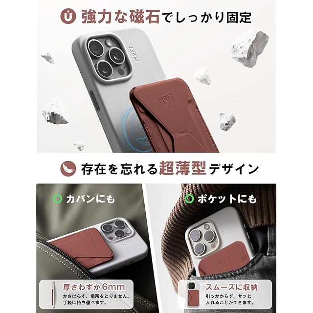✨【最新のヴィーガンレザー「MOVAS」採用!洗練されたスリムデザインで高耐久性】 「MOVAS」は、MOFTが誇りを持って開発したヴィーガンレザーで、その特長は一見の価値があります。この素材は驚くほど繊細な手触りを備えながら、同時に高い耐久性を持ち、さらには環境への優しさも追求しています。その結果、この素材を使用したスマホスタンドは、優れた張力と靱性を誇り、ポケットにキーホルダーやカードキーと一緒に収納しても傷がつきにくいのが特長です。洗練されたスリムデザインは、ユーザーに高級感をもたらし、日常のスタイリッシュな使い勝手を追求した結果として、このヴィーガンレザーのスマホスタンドは他と一線を画しています。