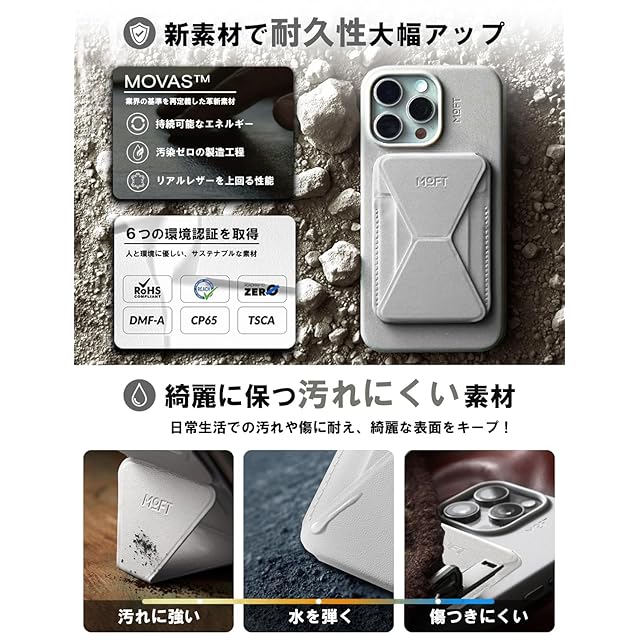 ✨【最新のヴィーガンレザー「MOVAS」採用!洗練されたスリムデザインで高耐久性】 「MOVAS」は、MOFTが誇りを持って開発したヴィーガンレザーで、その特長は一見の価値があります。この素材は驚くほど繊細な手触りを備えながら、同時に高い耐久性を持ち、さらには環境への優しさも追求しています。その結果、この素材を使用したスマホスタンドは、優れた張力と靱性を誇り、ポケットにキーホルダーやカードキーと一緒に収納しても傷がつきにくいのが特長です。洗練されたスリムデザインは、ユーザーに高級感をもたらし、日常のスタイリッシュな使い勝手を追求した結果として、このヴィーガンレザーのスマホスタンドは他と一線を画しています。