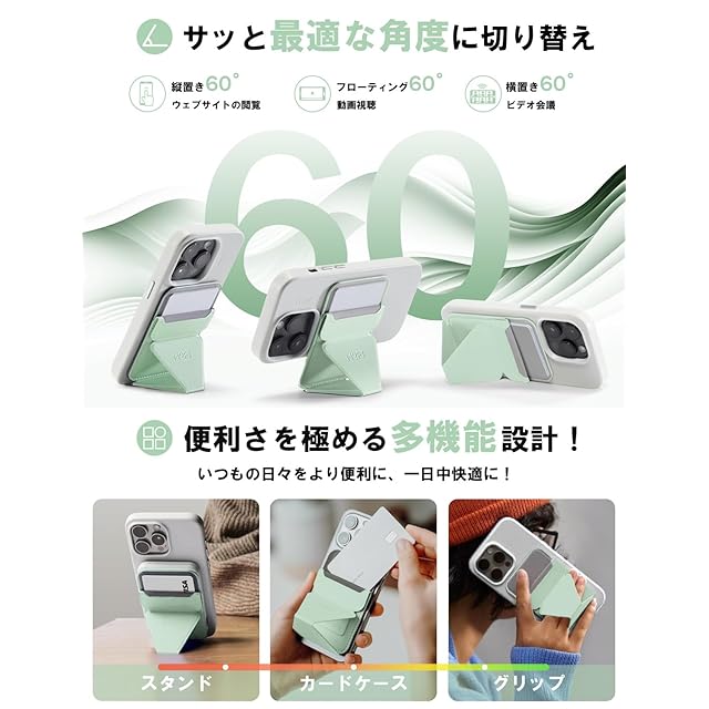 商品名:MOFT スマホスタンド 【MOVAS™ 耐久&磁力強化版】 Snap-On iPhone 16 iPhone 15 iPhone14 iPhone13 iPhone12 MagSafe対応 傷や汚れに強い マグネット カードケース 最大2枚収納 iPhoneスタンド Pro Plus ProMax 磁石 磁気吸着 薄型軽量 折り畳み式 ミニマリスト サステナブル (ミントグリーン)