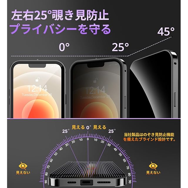 【覗き見防止とプライバシー保護】このiPhone12プロマックスケースは、覗き見防止技術により、左右の視野からの視線を防ぎ、画面のプライバシーを守ります。このiPhone12 Pro Max ケースは、斜めから見るとブラインドルーバーにより画面が真っ黒になりますが、真正面から見ると高透過率ではっきり見ることが出来ます。画面内容は勿論、個人情報も完璧守られます。満員電車や会議室など、様々な場所で活躍し【プライバシーを守り】ます。公共の場で他人に画面を見られるのが嫌な方はぜひ使ってみて下さい!画面を使用したバーコード決済などは、画面を明るくしてご使用ください。