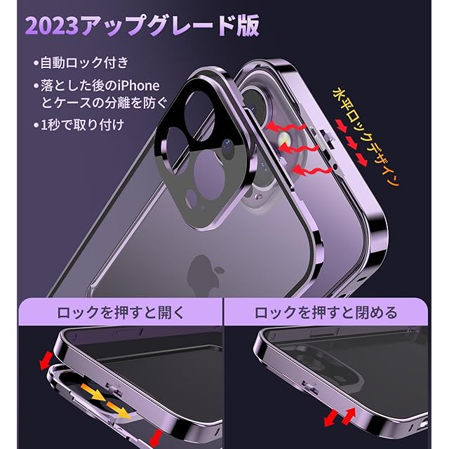 【ロック付きと一体型レンズ保護カバー】このアイフォン14 Pro ケースは上部にスライドボタン式のロックでケースの前後パーツをしっかり固定、万が一落下してもケースが分離せず、携帯がケースから飛び出す心配ないです。上部のボタンを押すだけで、ロックの解除も簡単、取り付けで開く非常に便利です。このスマホケース iphone14 proに統合レンズ保護カバーは、レンズを完全にカバーして保護します。また、このレンズ保護カバーは擦り傷防止、塵などの侵入を防止します。レンズ保護カバーの形状はiPhoneのオリジナルデザインを損ねることなく、ボディと一体化しています。注意:このiPhone14プロ ケースを使用するときは、画面に他のガラスフィルムを貼り付けないでください。タッチスクリーンの感度が非常に悪くなることがあります。