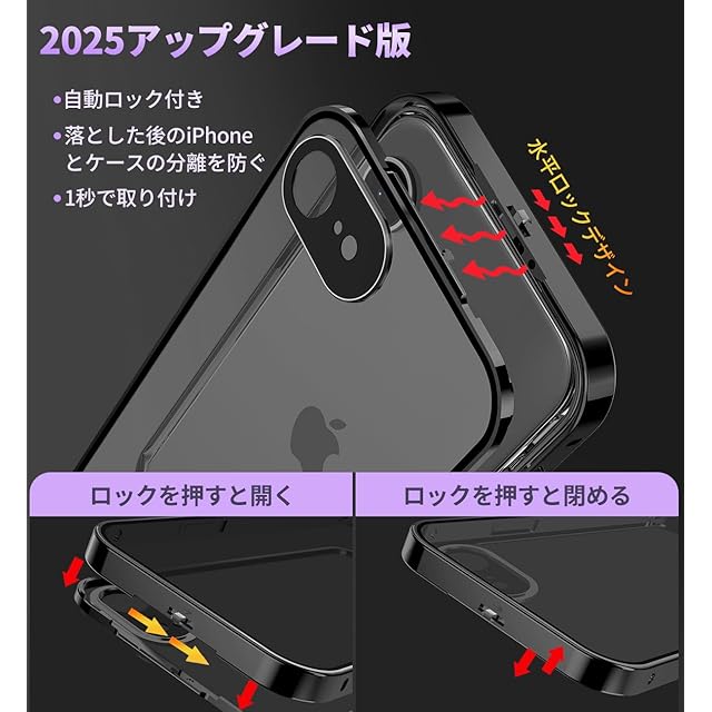 【ロック付きと1秒で取り付け】このアイフォン16eケースは上部にスライドボタン式のロックでケースの前後パーツをしっかり固定、万が一落下してもケースが分離せず、携帯がケースから飛び出す心配ないです。上部のボタンを押すだけで、ロックの解除も簡単、取り付けで開く非常に便利です。こちらのスマホケース iphone16eであなたの大切なスマホを守ってあげてください!注意:このあいふぉん16eケースを使用するときは、画面に他のガラスフィルムを貼り付けないでください。タッチスクリーンの感度が非常に悪くなることがあります。