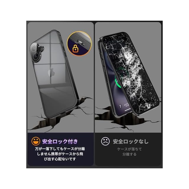 このアイフォン17ケースは上部にスライドボタン式のロックでケースの前後パーツをしっかり固定、万が一落下してもケースが分離せず、携帯がケースから飛び出す心配ないです。