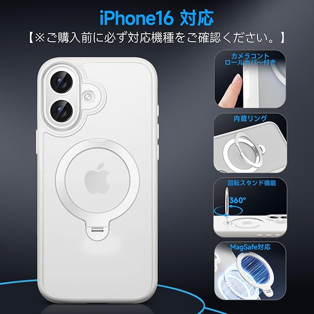 商品名:KISECASE 【カメラコントロールカバー ボタン保護・360度回転スタンド 】iPhone 16 用 ケース magsafe対応 ワイヤレス充電 磁気リング マグネット搭載 埃防止 耐衝撃 耐久性 黄ばみ防 滑り止め 落下保護 傷防止 携帯ケース アイフォン16 用 カバー リング ストラップホール マット仕上げ 指紋防止 (半透明+ホワイト, iPhone 16 用)