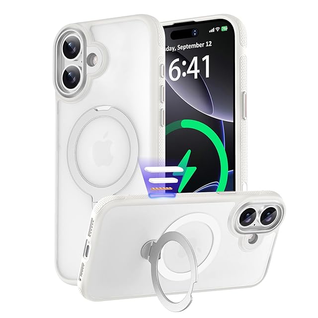 KISECASE 【カメラコントロールカバー ボタン保護・360度回転スタンド 】iPhone 16 用 ケース magsafe対応 ワイヤレス充電 磁気リング マグネット搭載 埃防止 耐衝撃 耐久性 黄ばみ防 滑り止め 落下保護 傷防止 携帯ケース アイフォン16 用 カバー リング ストラップホール マット仕上げ 指紋防止 (半透明+ホワイト, iPhone 16 用)