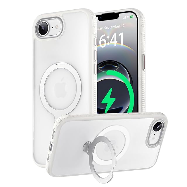 商品名:KISECASE iPhone 16e 用 ケース Magsafeアクセサリー対応 ワイヤレス充電 磁気リング マグネット搭載 定点360度回転スタンド ボタン保護 ホコリ防止 耐衝撃 耐久性 黄ばみ防 滑り止め 落下保護 傷防止 携帯ケース リング アイフォン16e 用 カバー ストラップホール付き (半透明+ホワイト, iPhone 16E 用)