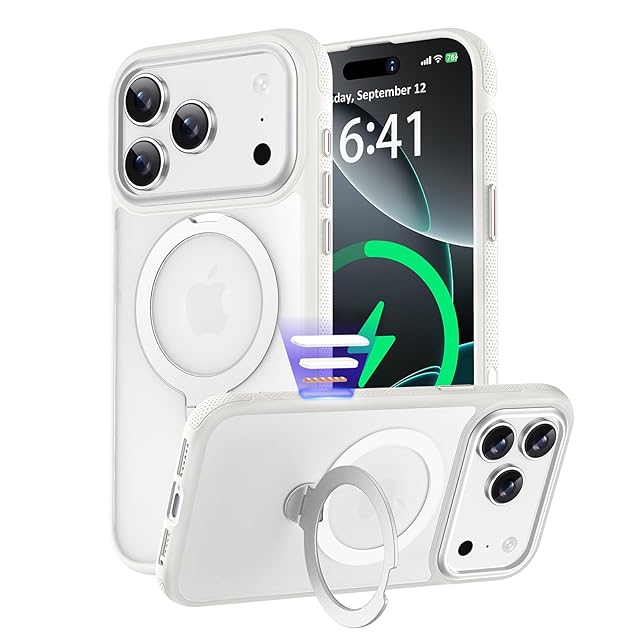 商品名:KISECASE iPhone17pro 用 ケース Magsafe 対応 ワイヤレス充電 磁気リング マグネット搭載 定点360度回転スタンド カメラコントロールカバー付き 耐衝撃 耐久性 黄ばみ防 滑り止め 落下保護 アイフォン 17 pro 用 カバー ストラップホール付き リング(半透明+ホワイト)