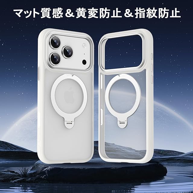 iPhone17pro用白ケース スマホリング付き 耐衝撃 半透明 回転スタンド