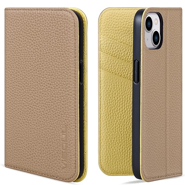 VISOUL iphone13 ケース 手帳型 本革 レザー スマホケース アイフォン13マグネット式 スタンド機能付き カード収納 携帯カバー 全面保護 柔軟なTPU素材 6.1インチ シュリンクレザー iPhone 13 ベージュレモン