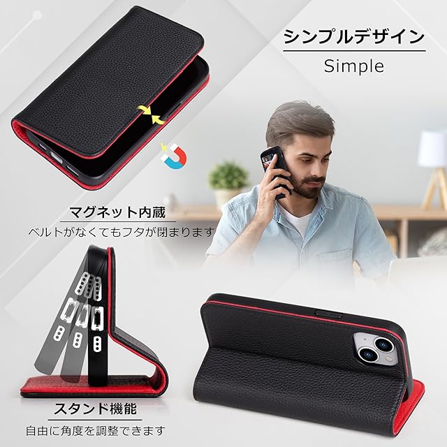 【収納機能、横置きスタンド機能】iPhone13miniケース内側に実用性のカード入れポケット×4、内側ポケット×1、カード類、現金、名刺、免許証入れなどを収納でき、通勤も通学にも楽々タイプです。マグネットが内蔵されているので、ベルトがなくてもフタがぴったり閉まります。横置きスタンド機能が付きまして、好きな角度を調節できて、手放しでも動画視聴や読書に楽しめる。