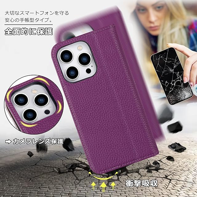 商品名:VISOUL iPhone14 Pro ケース 手帳型 本革 カードポケット アイフォン14 Pro ケース 手帳型 本革 レザー スマホケース iPhone 14 Pro 手帳ケース カード収納 衝撃吸収TPU素材 携帯ケース 全面保護 マグネット 横置きスタンド アイホン14 Pro 対応 6.1インチ iphone 14 Pro パープル ピック
