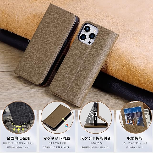 【本革手帳型ケース】背面だけでなく、画面を覆っているため、画面から直接地面に落ちる場合は、スマホの画面を保護してくれるので安心といったイメージがあります。カバーの面積が広くなり、カバーの外側や内側を有効利用できる点も手帳型の魅力の1つでしょう。カバーの内側にポケットがあり、カード型のものを収納しておけます。定期やクレジットカードといったものは、生活する上で頻繁に使いますよね。