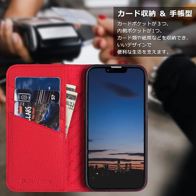 【本革手帳型ケース】背面だけでなく、画面を覆っているため、画面から直接地面に落ちる場合は、スマホの画面を保護してくれるので安心といったイメージがあります。カバーの面積が広くなり、カバーの外側や内側を有効利用できる点も手帳型の魅力の1つでしょう。カバーの内側にポケットがあり、カード型のものを収納しておけます。定期やクレジットカードといったものは、生活する上で頻繁に使いますよね。