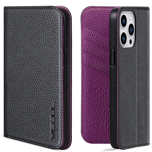 VISOUL iPhone14 ProMax ケース 手帳型 本革 アイフォン14 ProMax ケース 手帳型 本革 レザー スマホケース iPhone 14 ProMax 手帳ケース 柔軟なTPU素材 カード収納 携帯ケース 全面保護 マグネット 横置きスタンド アイフォン14 ProMax 手帳 対応 6.7インチ iphone 14 ProMax ブラック パープル