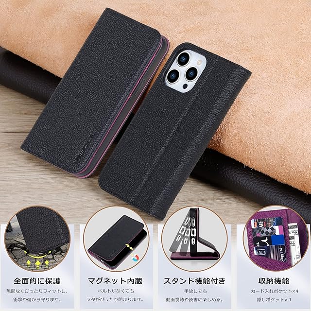 商品名:VISOUL iPhone14 ProMax ケース 手帳型 本革 アイフォン14 ProMax ケース 手帳型 本革 レザー スマホケース iPhone 14 ProMax 手帳ケース 柔軟なTPU素材 カード収納 携帯ケース 全面保護 マグネット 横置きスタンド アイフォン14 ProMax 手帳 対応 6.7インチ iphone 14 ProMax ブラック パープル