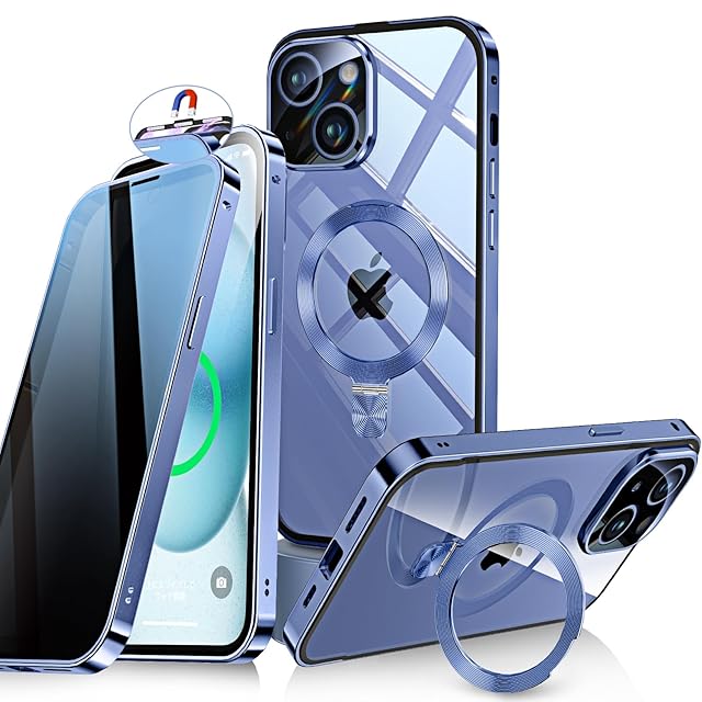 Bluoocase【自動スライドロック!3in1スタンド・覗き見防止】iPhone 15 用 ケース 全面保護 Magsafe対応・CDリング 縦横両立 アイフォン15 カバー 9H強化ガラス ワイヤレス充電 両面 一体型レンズ保護 高感度タッチ ストラップホール付き 透明黄変防止PC背面 指紋防止アルミバンパー いphone15 用 携帯ケース 6.1インチ(ブルー)