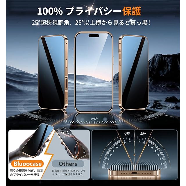 【完全防御!スマホ&プライバシーの二重防護】このいphone16promax 全面保護ケースは、プライバシー保護と軍用レベルの防御機能を両立した両面完全防護ケース。"見えない装甲"のような全方位ガードを実現しました。画面と一体型レンズカバーには9H軍用級強化ガラスを採用し、従来材質比3倍の耐キズ性能を発揮。特に防覗(プライバシー)フィルムは25°ゴールドアングルを実現(一般的な28°より精密),超薄型貼り付け工法によりタッチ感度を損ないません。フレームは航空機級アルミニウム合金を27の精密工程で加工。金属の高級質感を保ちつつ、特殊構造設計で電波妨害をゼロに抑えました。このアイフォン16 pro max 全面 ケースはプライバシー保護と物理的防御の完璧なバランスを実現する逸品です