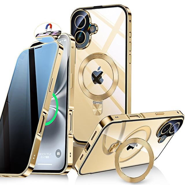 Bluoocase【自動スライドロック!3in1スタンド・覗き見防止】iPhone 16 用 ケース 全面保護 Magsafe対応・CDリング 縦横両立 アイフォン16 カバー 9H強化ガラス ワイヤレス充電 両面 一体型レンズ保護 高感度タッチ ストラップホール付き 透明黄変防止PC背面 指紋防止アルミバンパー いphone16 用 携帯ケース 6.1インチ(ゴールド)