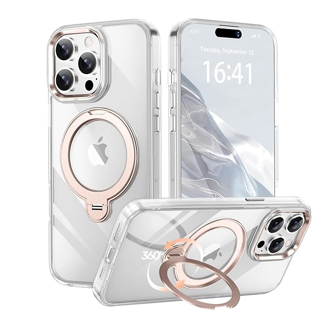 商品名:【透き通る上質感・多機能360°回転スタンド】KMAMBNG iPhone 15 用 ケース Magsafe対応【耐衝撃・金属感・真空メッキ・黄変防止・ストラップホール付き】縦横両立 角度自在 調整可能 磁吸機能でワイヤレス充電対応 おしゃれ スマホケース(クリア&ローズゴールド, iPhone 15)