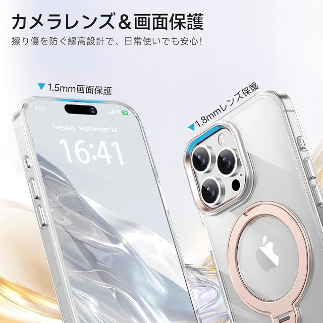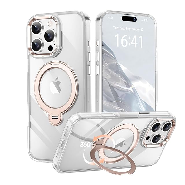 商品名:【透き通る上質感・多機能360°回転スタンド】KMAMBNG iPhone 16 ProMax 用 ケース【耐衝撃・金属感・真空メッキ・黄変防止・ストラップホール付き】縦横両立 角度自在 調整可能 磁吸機能でワイヤレス充電対応 おしゃれ スマホケース(クリア&ローズゴールド,iPhone 16 Pro Max)