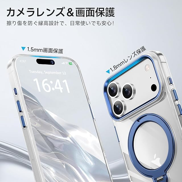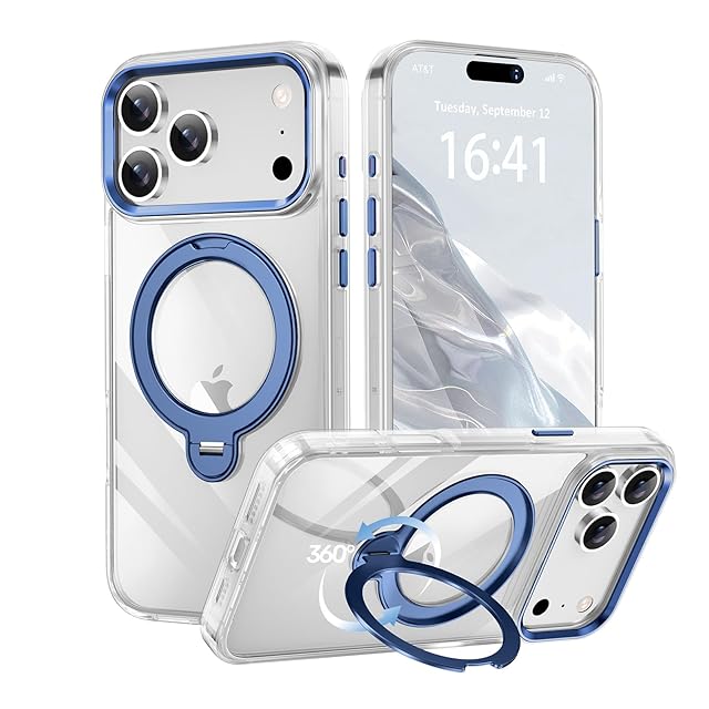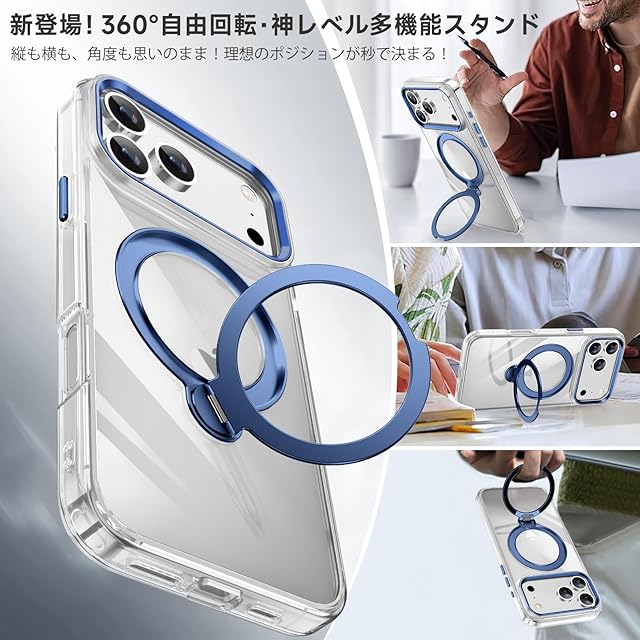 商品名:【透き通る上質感・多機能360°回転スタンド】KMAMBNG iPhone 17 ProMax 用 ケース Magsafe対応【耐衝撃・金属感・真空メッキ・黄変防止・ストラップホール付き】縦横両立 角度自在 調整可能 磁吸機能でワイヤレス充電対応 おしゃれ スマホケース(クリア&ブルー,iPhone 17 Pro Max)