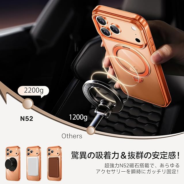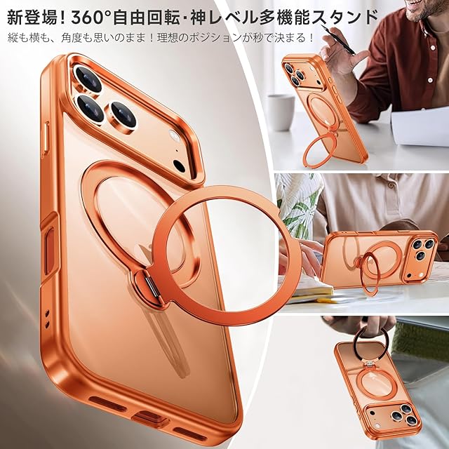商品名:【透き通る上質感・多機能360°回転スタンド】KMAMBNG iPhone 17 ProMax 用 ケース Magsafe対応【耐衝撃・金属感・真空メッキ・黄変防止・ストラップホール付き】縦横両立 角度自在 調整可能 磁吸機能でワイヤレス充電対応 おしゃれ スマホケース(オレンジ,iPhone 17 Pro Max)