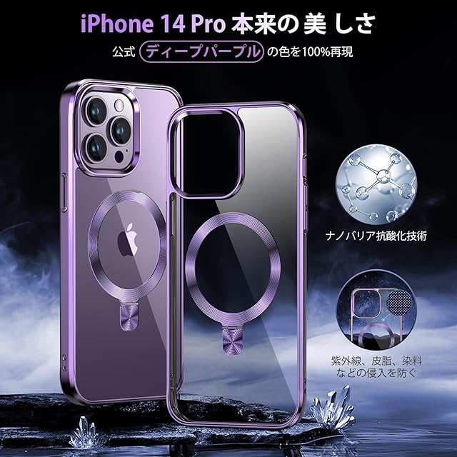 商品名:【CD MagSafeリング・スタンド一体】iPhone14 Pro 用クリアケース[MagSafe対応・隠しスタンド] [本体の色・メッキバンパー]ストラップホール付き 角度調整可 米軍MIL規格取得・耐衝撃 アイホン14 Pro透明ケース スマホケース14プロ人気6.1インチ(ディープパープル)