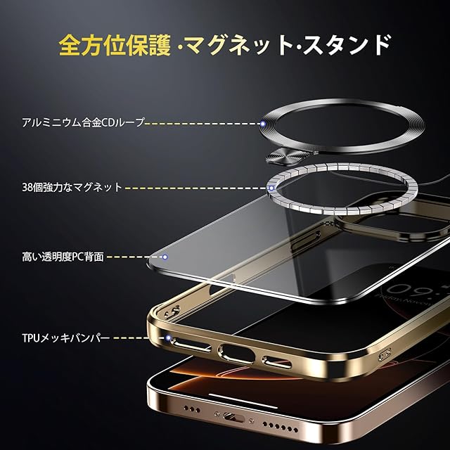 商品名:【CD MagSafeリング・スタンド一体】iPhone 16 Pro 用クリアケース[MagSafe対応・隠しスタンド] [本体の色・メッキバンパー]ストラップホール付き 角度調整可 米軍MIL規格取得・耐衝撃 アイホン16 Pro透明ケース スマホケース16プロ人気6.3インチ(ゴールド)
