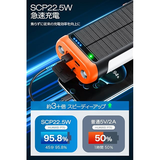 商品名:ソーラーモバイルバッテリー 【2025最新 61800mAh大容量 & 手回し発電】 22.5W/PD18W 急速充電 4本ケーブル内蔵 6台同時充電 ソーラーチャージャー 側面ライト+LEDライト付き IP67防水 防塵 耐衝撃 5way蓄電 モバイルバッテリー ソーラー充電器 コンパス搭載 フック付き 携帯便利 アウトドア/旅行/地震/災害/緊急用 防災グッズ (オレンジ)