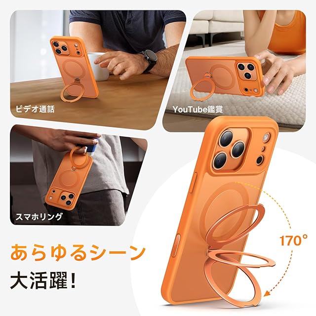 【2025革新登場・360°回転スタンド】Peerock iPhone 17 Pro Max 用ケース MagSafe対応 縦横両対応 角度自由調整 カメラコントロールボタン 米軍MIL規格 精密カメラ保護 耐衝撃 高耐久性 フィット感 ワイヤレス充電対応 半透明マット 指紋防止 強力磁力 いphone17promax 用 ケース 6.9インチ (オレンジ・コズミックオレンジ)