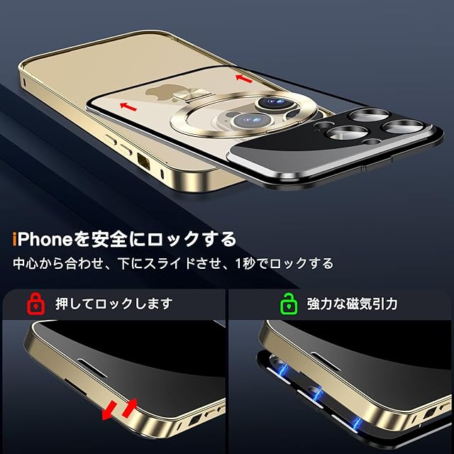 商品名:【スライドカバー磁気ロック・覗き見防止・新次元の一体型カメラ保護 +CD隠しスタンド】MESTRIEV iPhone 15 Pro 用 ケース 全面保護 Magsafe対応 ランヤードホール付き [本体を再現・マット金属フレーム ] 縦横両対応 9H強化ガラス ワイヤレス充電対応 クリア 両面スマホケース 高感度タッチ いphone15Pro 用 ケース 6.1インチ (ゴールド)