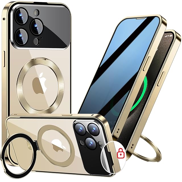 【スライドカバー磁気ロック・覗き見防止・新次元の一体型カメラ保護 +CD隠しスタンド】MESTRIEV iPhone 15 Pro 用 ケース 全面保護 Magsafe対応 ランヤードホール付き [本体を再現・マット金属フレーム ] 縦横両対応 9H強化ガラス ワイヤレス充電対応 クリア 両面スマホケース 高感度タッチ いphone15Pro 用 ケース 6.1インチ (ゴールド)