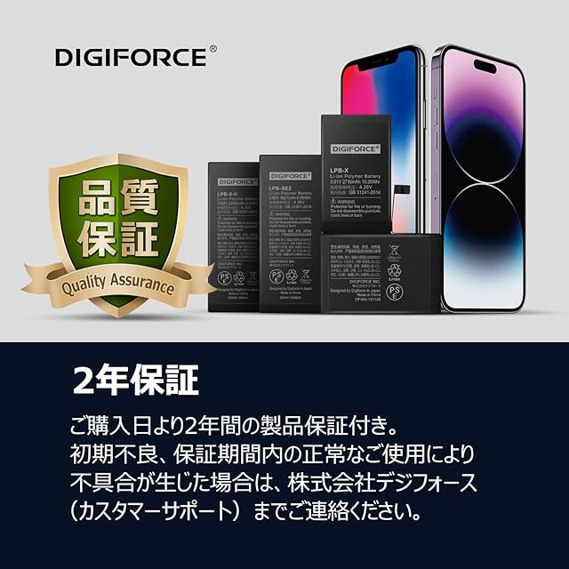 【2年間(24か月)の製品付き】本バッテリーの初期不良や期間内の正常なご使用により膨張(兆候含む)等の不具合が生じた場合は、速やかにiPhoneの使用を中止し、販売元までご相談ください。迅速に対応いたします。 (※バッテリー交換直後に電池の減りが早い等の問題が生じた場合は、一度、バッテリーのキャリブレーション(0%まで使い切り、そこから一気に100%まで充電する)を数回行ってみてください。症状が改善する場合がございます。)