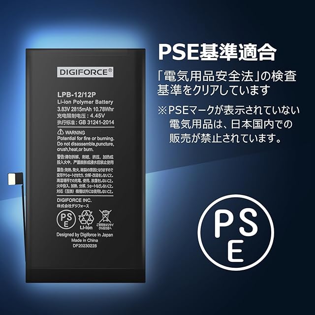 【PSE認証品】本製品は安心のPSE認証済みのバッテリーです。電気用品安全法で定められた検査を実施し、基準適合性を満たしております。