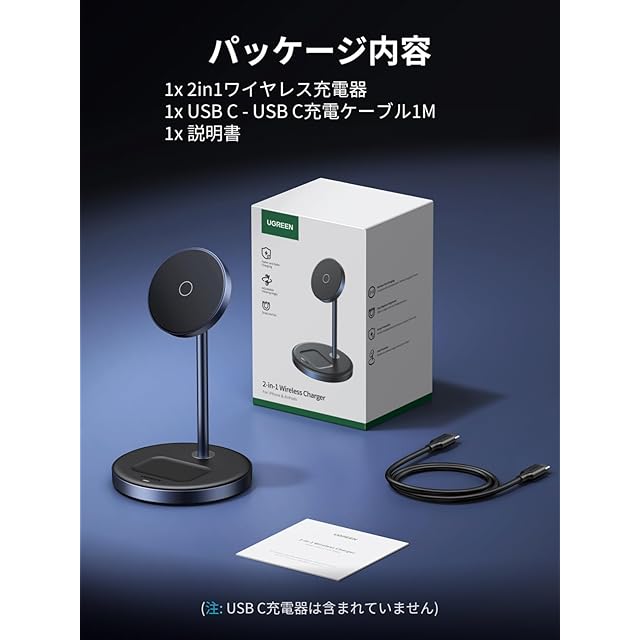 商品名:UGREEN MagFlow Magsafe充電器 2 in 1マグネット 充電スタンド Qi認証 ワイヤレス充電器 15W/7.5W/5W 2台同時急速充電 横向き・縦向きで角度調整 iPhone 17/16/15/14/13/12シリーズAirPods Pro/3/2/1など適用 USB-Cケーブル付き