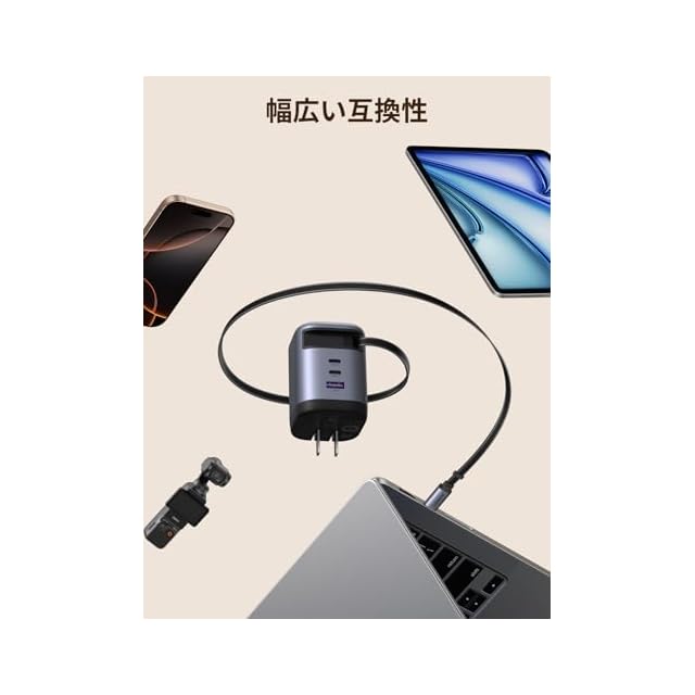 商品名:UGREEN 100W Type-C 充電器 【75CM 巻き取り式】 8階段調整可能 USB-Cケーブル内蔵 4ポート同時充電可能 PD3.0 旅行/出張/収納/スマホ/パソコン/タップレットなどType-C適合 iphone17シリーズ