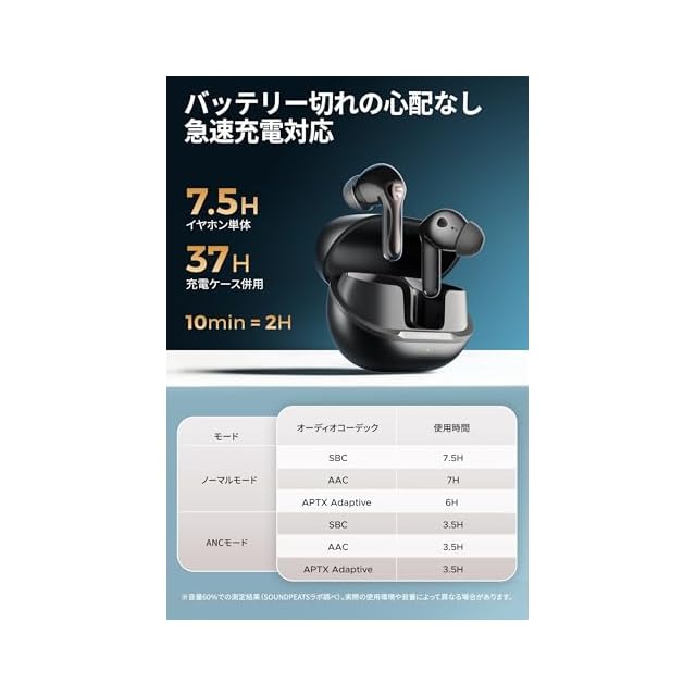 【バッテリー切れの心配なし!最大37時間再生可能&急速充電対応】イヤホン単体で7.5時間の連続再生が可能※。充電ケースを併用すれば合計37時間もの長時間バッテリーライフを実現します。さらに、急速充電に対応しており、わずか10分の充電で2時間の再生が可能です。長時間の音楽鑑賞はもちろん、外出先での急なバッテリー切れの心配もこれで解決。快適なサウンド体験を、どこでも存分にお楽しみいただけます。また、イヤホンはIPX5の防水性能を備えており、アウトドアやスポーツシーンでも安心してご利用いただける快適な音楽体験をお届けします!※(AACコーデック、音量60%、通常モード、ANC OFFで測定)再生時間は音楽再生時の時間であり、音量、再生内容、使用環境によって異なる場合があります。