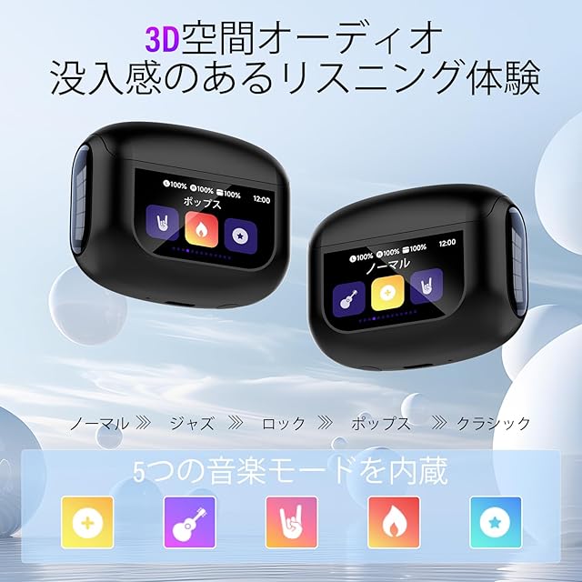 多機能スマートタッチスクリーン:このタッチスクリーンイヤホンにはカラータッチディスプレイが搭載されています。イヤホン本体または充電ケースから、音楽の再生、曲の切り替え、通話の応答と終了、ノイズキャンセリングモードの有効化など、様々な操作が可能です。さらに、タッチスクリーンには、音量調整、カメラ操作、7言語切り替え、壁紙切り替え、画面の明るさ調整、イヤホン検索、懐中電灯、タイマーなどの機能も搭載されています